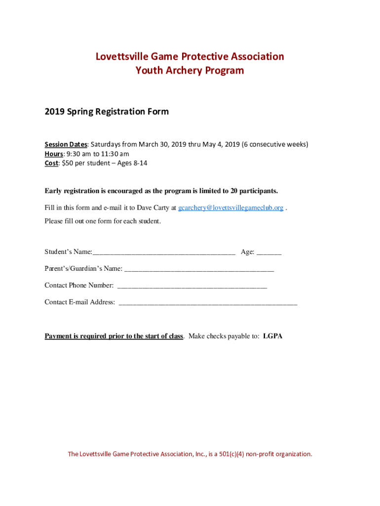 UNCLASSIFIEDLovettsville Game Protective Association Youth Archery Program2019 Spring Registration Form Session Dates: Saturdays from March 30, 2019, through May 4, 2019 (6 consecutive weeks) Hours: