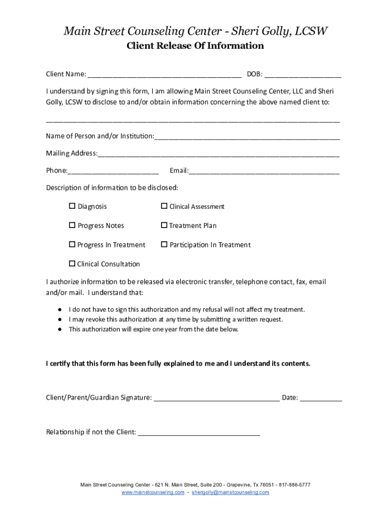 MainStreetCounselingCenterSheriGolly, LCSW ClientReleaseOfInformation Clientele: DOB: Iunderstandbysigningthisform, IamallowingMainStreetCounselingCenter, LLCandSheri Golly, LCSWtodisclosetoand/orobtaininforma
