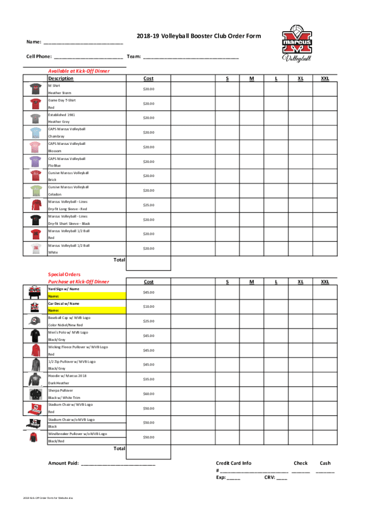 Name: 201819 Volleyball Booster Club Order Foretell Phone: Team: Available at Kickoff Dinner DescriptionCostM ShirtSMLXLXXLSMLXLXXL$20.00Heather Storm Game Day TShirt$20.00Red Established $198120.00Heather