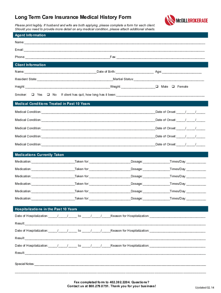 Long Term Care Insurance Medical History Form Please print legibly. If husband and wife are both applying, please complete a form for each client. Should you need to provide more detail on any medical