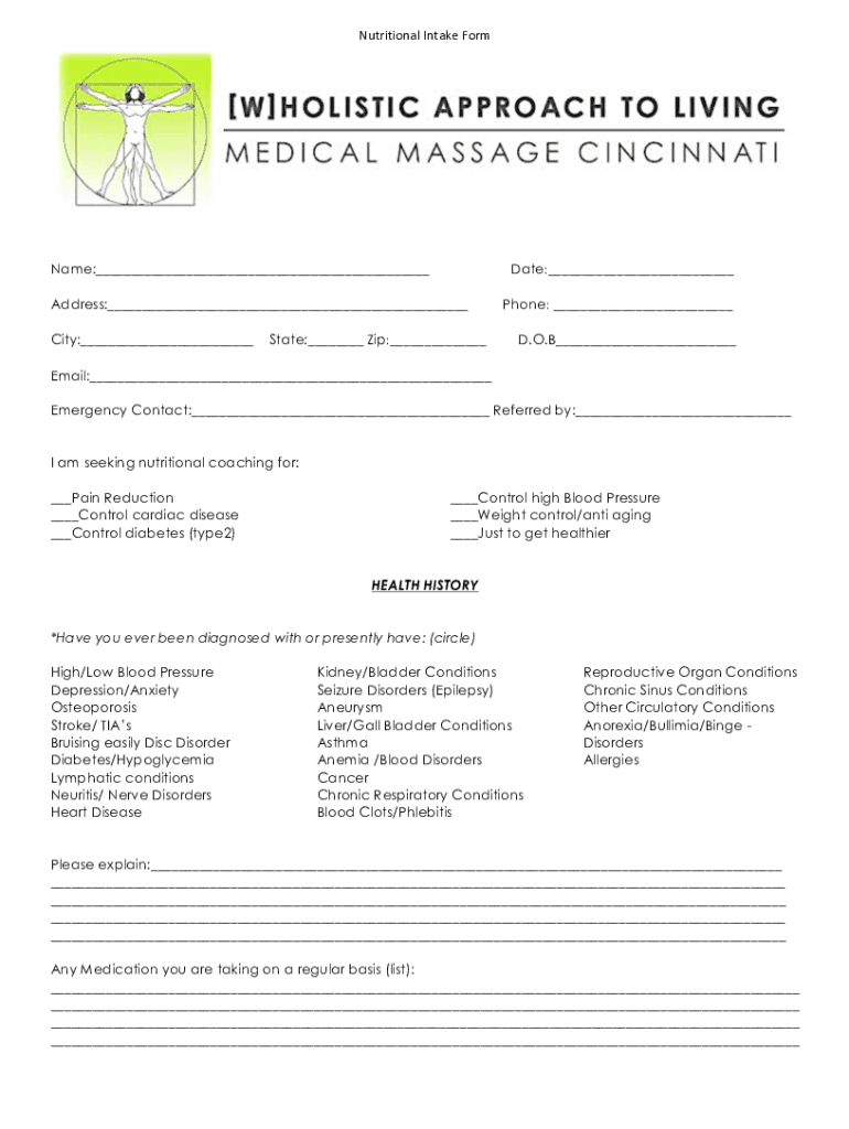Nutritional Intake Forename: Date: Address: Phone: City: State: Zip: D.O.B Email: Emergency Contact: Referred by: I am seeking nutritional coaching for: Pain Reduction Control cardiac disease Control