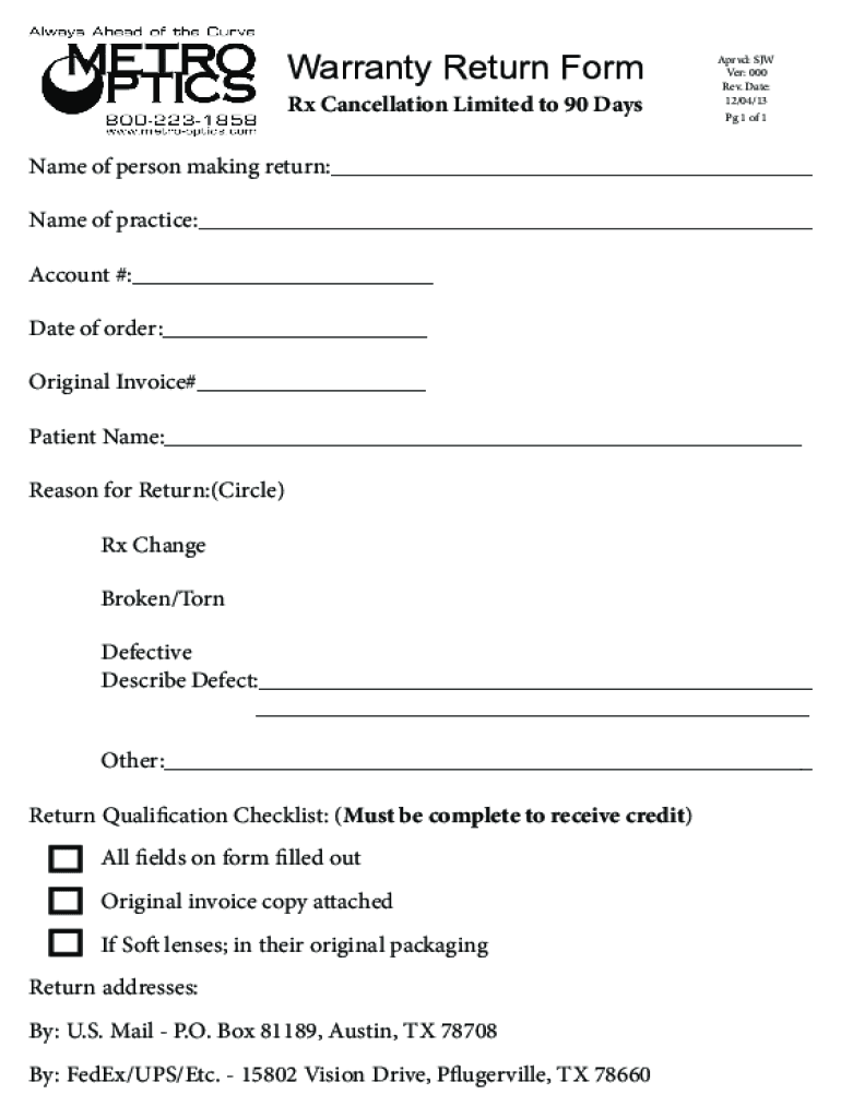 Warranty Return Form Rx Cancellation Limited to 90 DaysAprvd: SJW Very: 000 Rev. Date: 12/04/13 Pg 1 of 1Name of person making return: Name of practice: Account #: Date of order: Original Invoice#