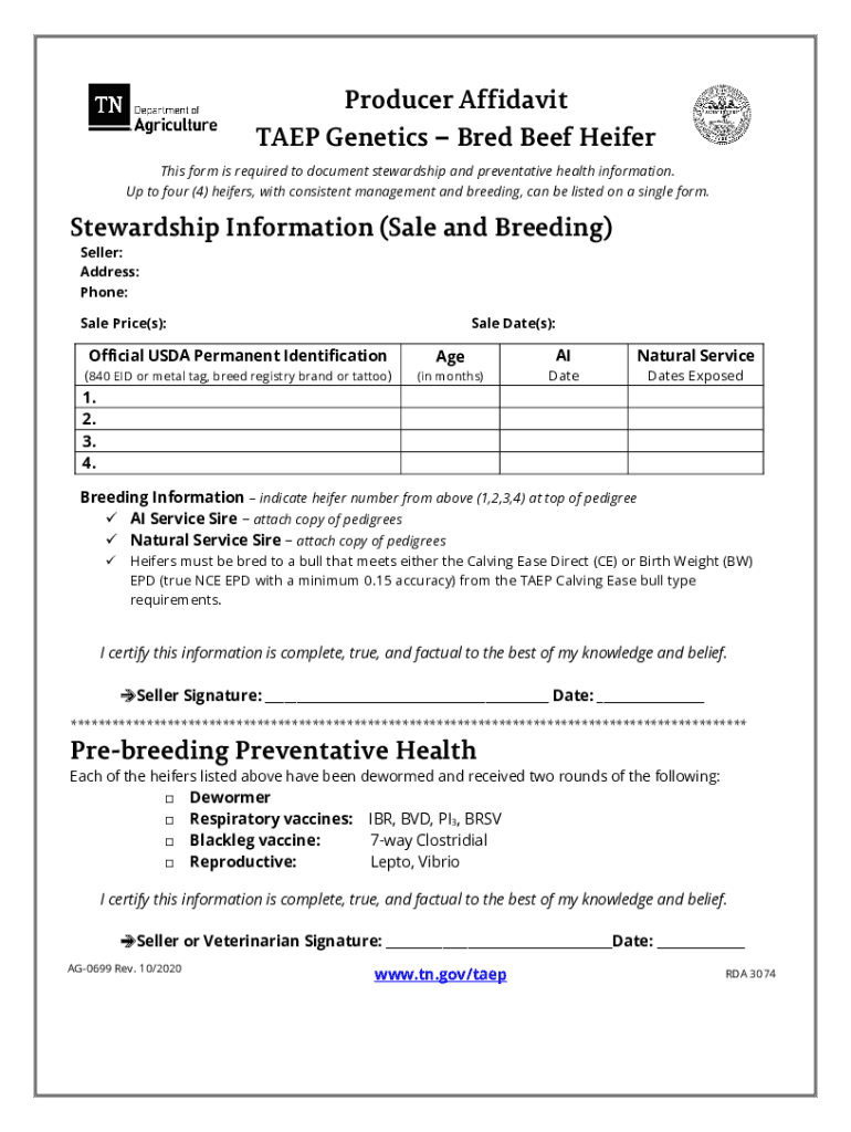 Producer Affidavit TAP Genetics Bred Beef Heifer This form is required to document stewardship and preventative health information. Up to four (4) heifers, with consistent management and breeding,