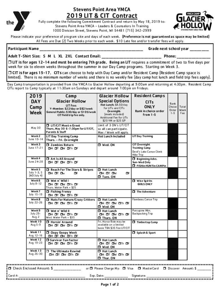 Stevens Point Area YMCA2019 LIT & CIT Contract Fully complete the following Commitment Contract and return by May 18, 2019, to: Stevens Point Area YMCA Leaders & Counselors In Training 1000 Division