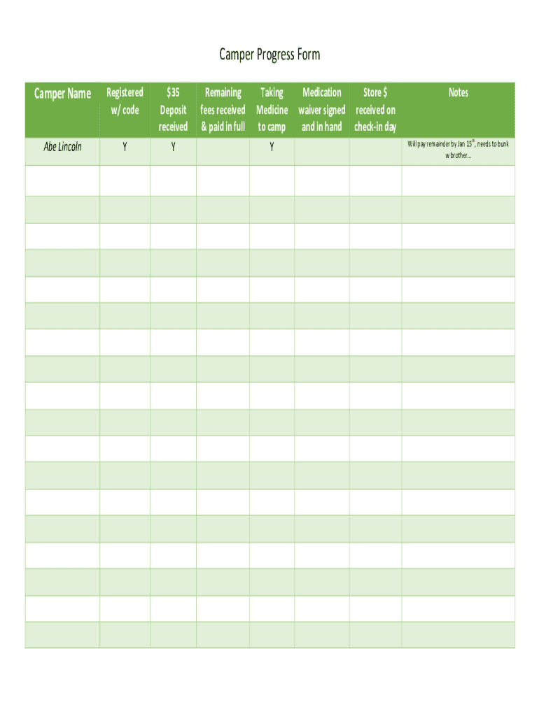 Camper Progress FormRemainingTakingfees receivedMedicine& paid in full to campYCamper NameRegisteredw/ code Abe LincolnY$35DepositreceivedY