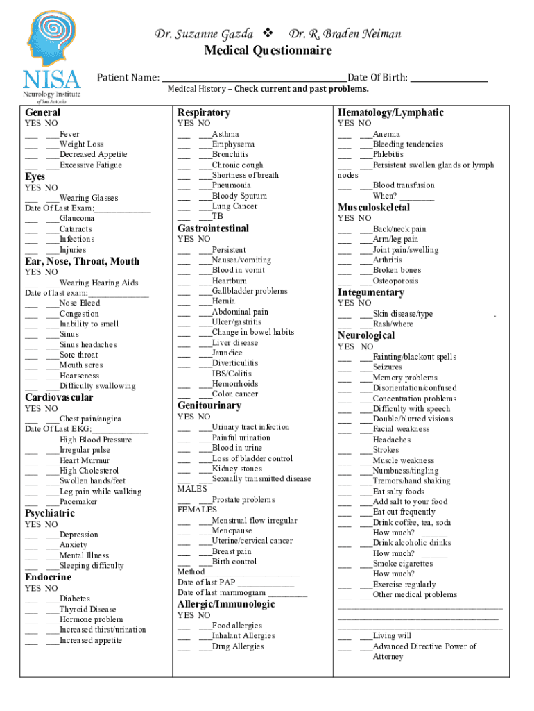 Dr. Suzanne Gaza Dr. R. Braden Paramedical QuestionnairePatient Name:Date Of Birth: Medical History Check current and past problems. GeneralRespiratoryHematology/Lymphatics YES YES NO Anemia Bleeding