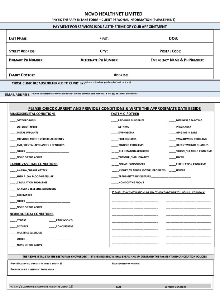NOVA HEALTHIER LIMITED PHYSIOTHERAPY INTAKE FORM CLIENT PERSONAL INFORMATION (PLEASE PRINT)PAYMENT FOR SERVICES IS DUE AT THE TIME OF YOUR APPOINTMENTS NAME:FIRST:STREET ADDRESS:CITY:PRIMARY PH NUMBER:DOB: