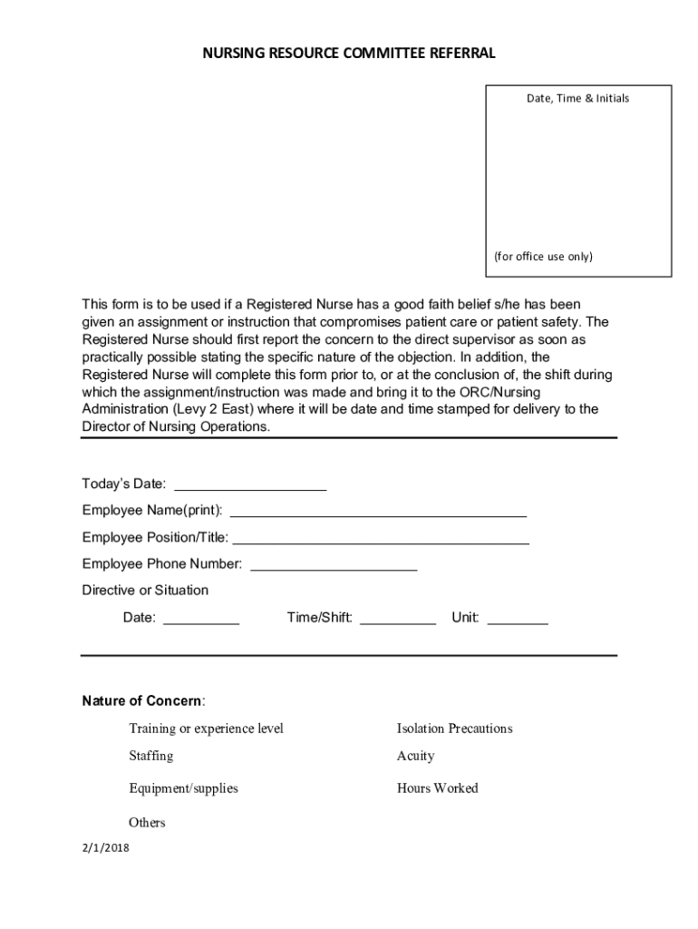 NURSING RESOURCE COMMITTEE REFERRALDate, Time & Initials(for office use only)This form is to be used if a Registered Nurse has a good faith belief s/he has been given an assignment or instruction