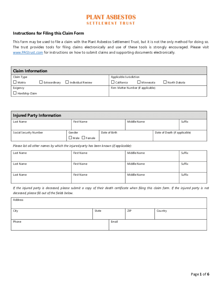 This form may be used to file a claim with the Plant Asbestos Settlement Trust, but it is not the only method for doing so.