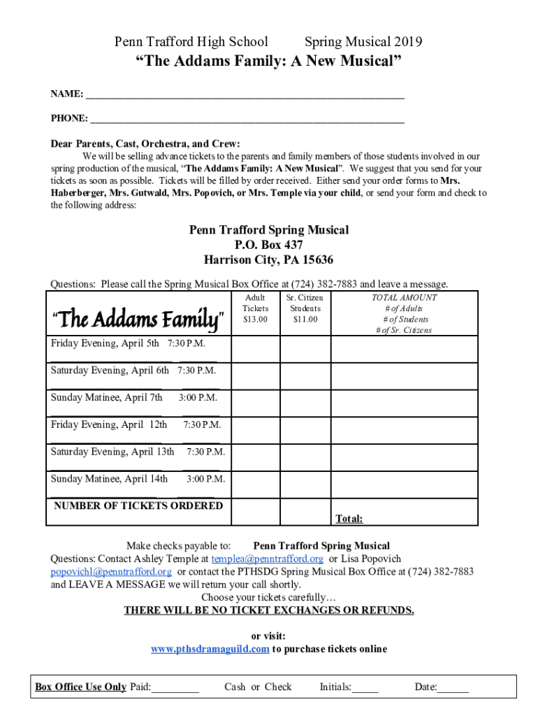 Penn Trafford High Schooling Musical 2019The Addams Family: A New Musical NAME: PHONE: Dear Parents, Cast, Orchestra, and Crew: We will be selling advance tickets to the parents and family members