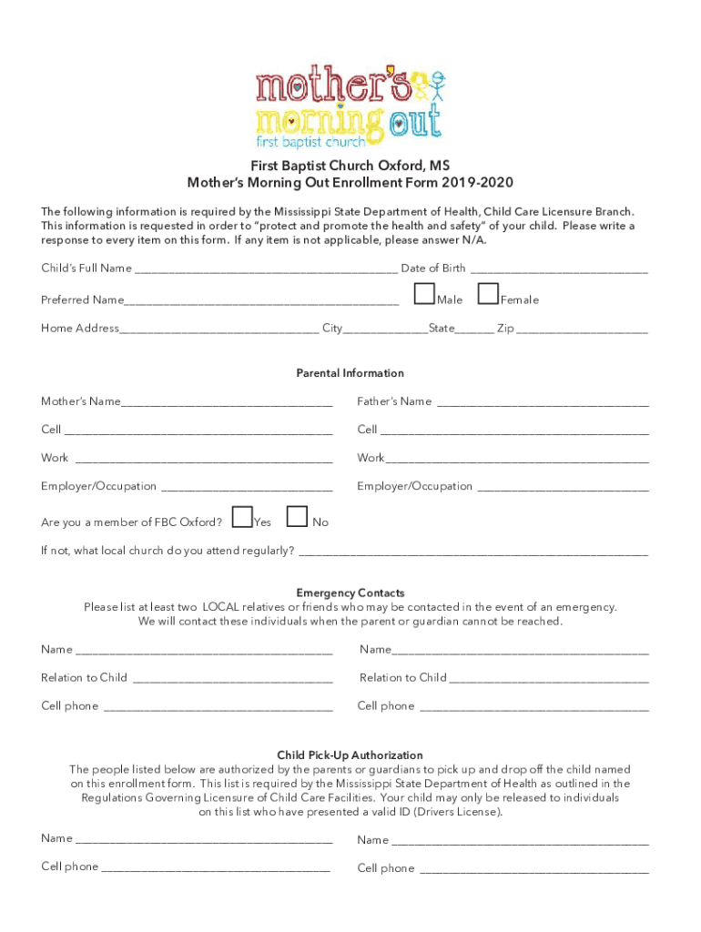 First Baptist Church Oxford, MS Mothers Morning Out Enrollment Form 20192020 The following information is required by the Mississippi State Department of Health, Child Care Licensure Branch. This