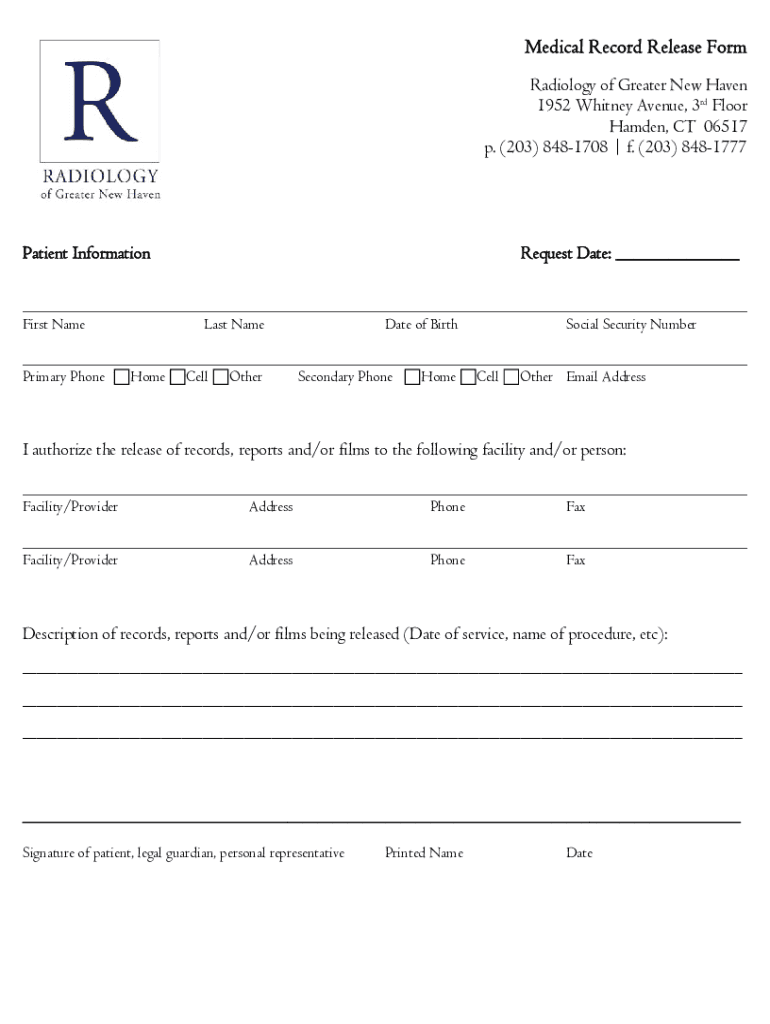 Medical Record Release Form Radiology of Greater New Haven 1952 Whitney Avenue, 3rd Floor Hamden, CT 06517 p. (203) 8481708 f. (203) 8481777Patient InformationRequest Date: First Name Last Name Date