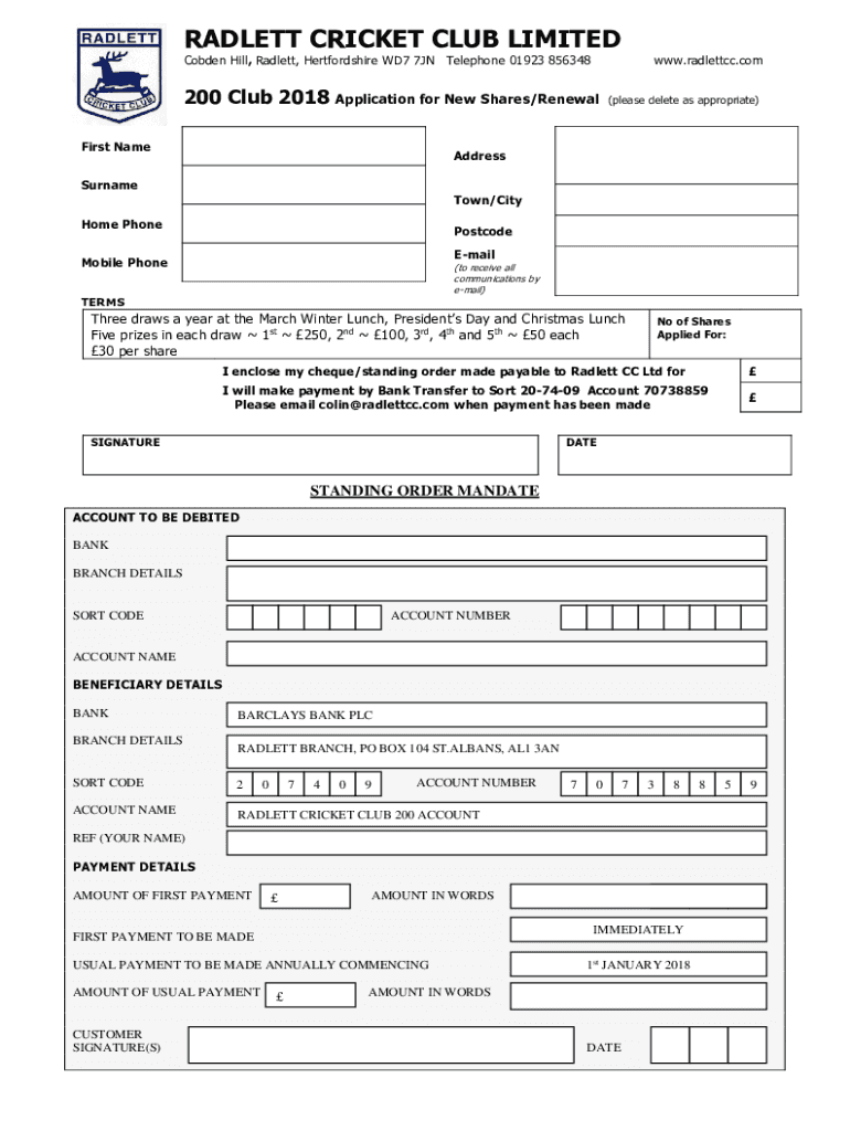 HALLETT CRICKET CLUB LIMITED Cob den Hill, Hallett, Hertfordshire WD7 7JN Telephone 01923 856348www.radlettcc.com200 Club 2018 Application for New Shares/Renewal First Name(please delete as appropriate)AddressSurname