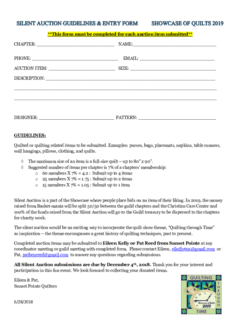 **This form must be completed for each auction item submitted** CHAPTER: NAME: PHONE: EMAIL: AUCTION ITEM: SIZE: DESCRIPTION: DESIGNER: PATTERN: GUIDELINES: Quilted or quilting related items to be