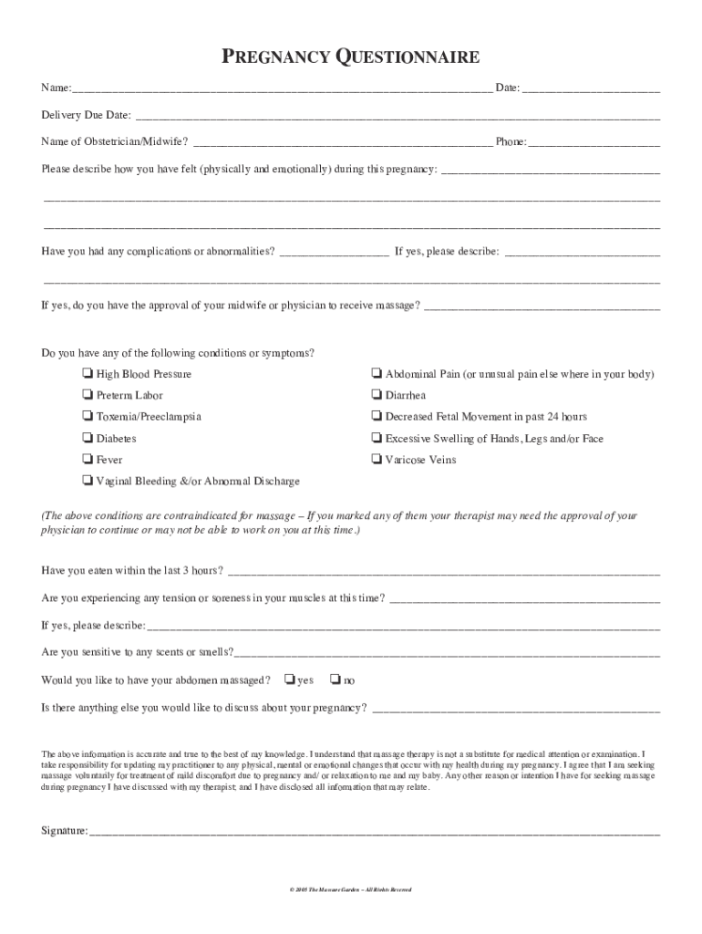 PREGNANCY QUESTIONNAIRE Name: Date: Delivery Due Date: Name of Obstetrician/Midwife? Phone: Please describe how you have felt (physically and emotionally) during this pregnancy: Have you had any complications