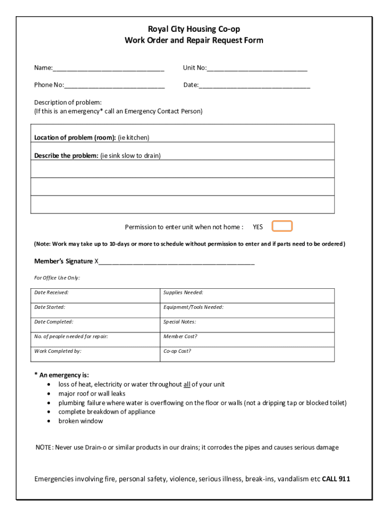 Royal City Housing Coop Work Order and Repair Request Form Name: Unit No: Phone No: Date: Description of problem: (If this is an emergency* call an Emergency Contact Person)Location of problem (room):