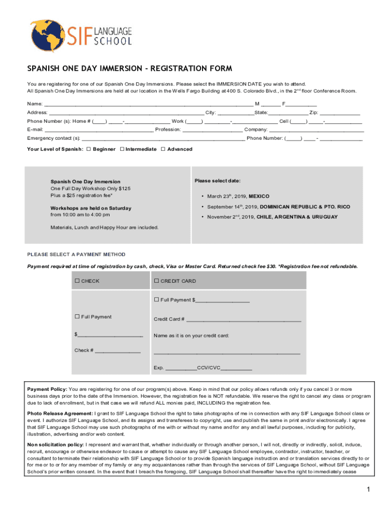 SPANISH ONE DAY IMMERSION REGISTRATION FORM You are registering for one of our Spanish One Day Immersions. Please select the IMMERSION DATE you wish to attend. All Spanish One Day Immersions are held