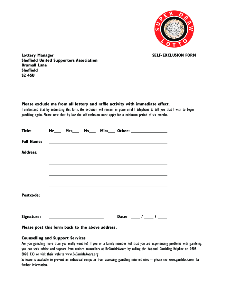 SUPAWLottery Manager Sheffield United Supporters Association Bra mall Lane Sheffield S2 4SURLER DO T OSELFEXCLUSION Formulas exclude me from all lottery and raffle activity with immediate effect.