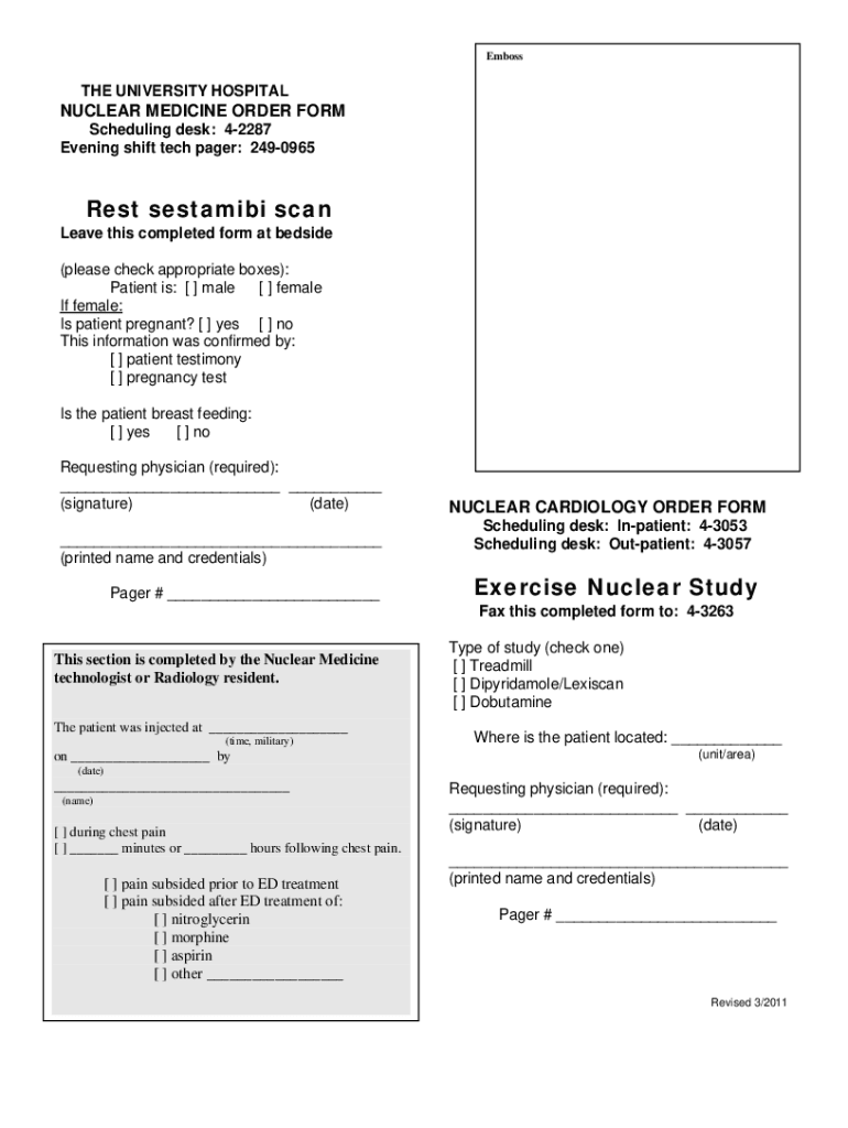 Embossed UNIVERSITY HOSPITALNUCLEAR MEDICINE ORDER FORM Scheduling desk: 42287 Evening shift tech pager: 2490965Rest sestamibi scan Leave this completed form at bedside (please check appropriate boxes):