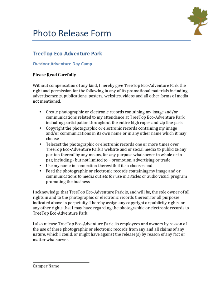 Photo Release FormTreeTop Adventure ParkOutdoor Adventure Day Appease Read CarefullyWithout compensation of any kind, I hereby give Treetop Adventure Park the right and permission for the following in any of its promotional materials including