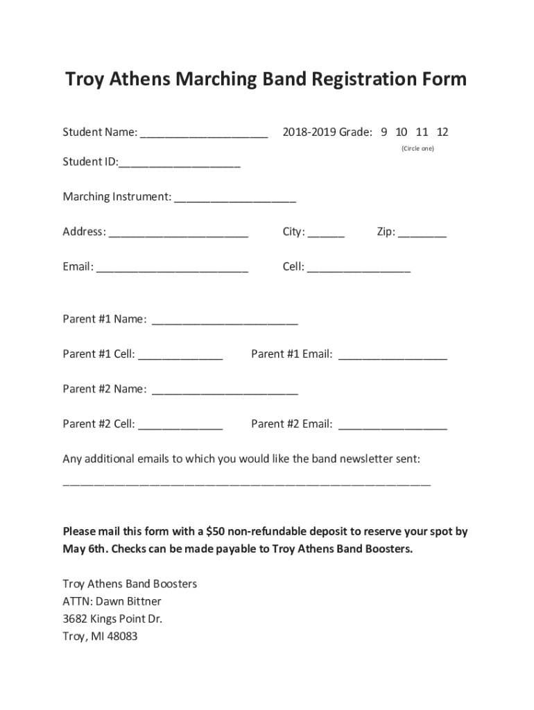 Troy Athens Marching Band Registration Form Student Name: Student ID: 20182019 Grade: 9 10 11 12 (Circle one)Marching Instrument: Address: City: Zip: Email: Cell: Parent #1 Name: Parent #1 Cell: Parent
