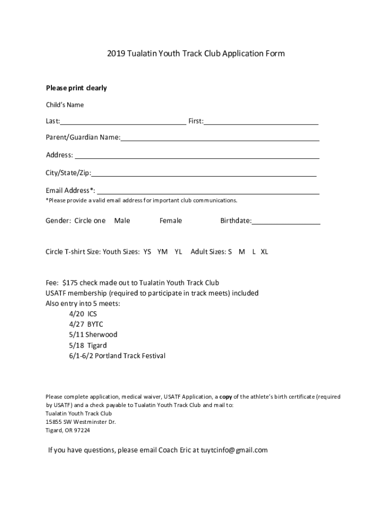 2019 Tualatin Youth Track Club Application Formulas print clearly Child's Nameless: First: Parent/Guardian Name: Address: City/State/Zip: Email Address*: *Please provide a valid email address for
