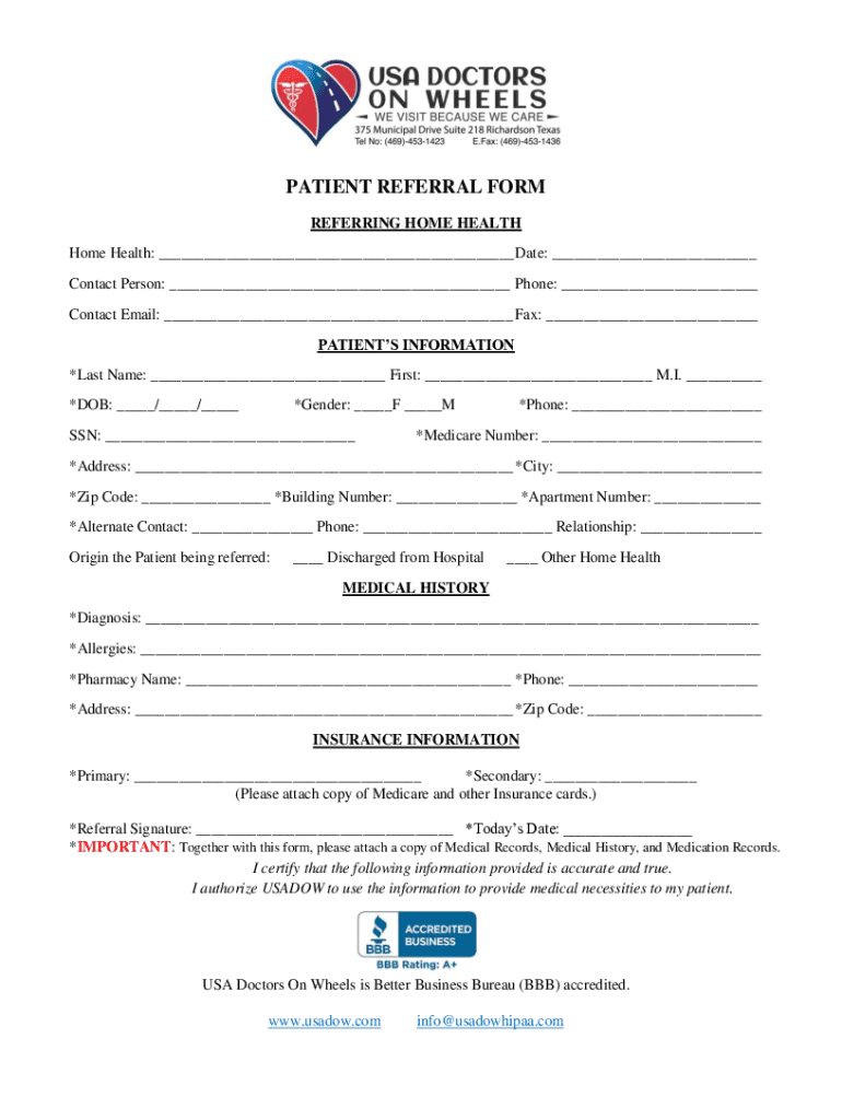 PATIENT REFERRAL FORM REFERRING HOME HEALTH: Date: Contact Person: Phone: Contact Email: Fax: PATIENTS INFORMATION *Last Name: First: M.I. *DOB: / / *Gender: FM SSN: *Phone: *Medicare Number: *Address: