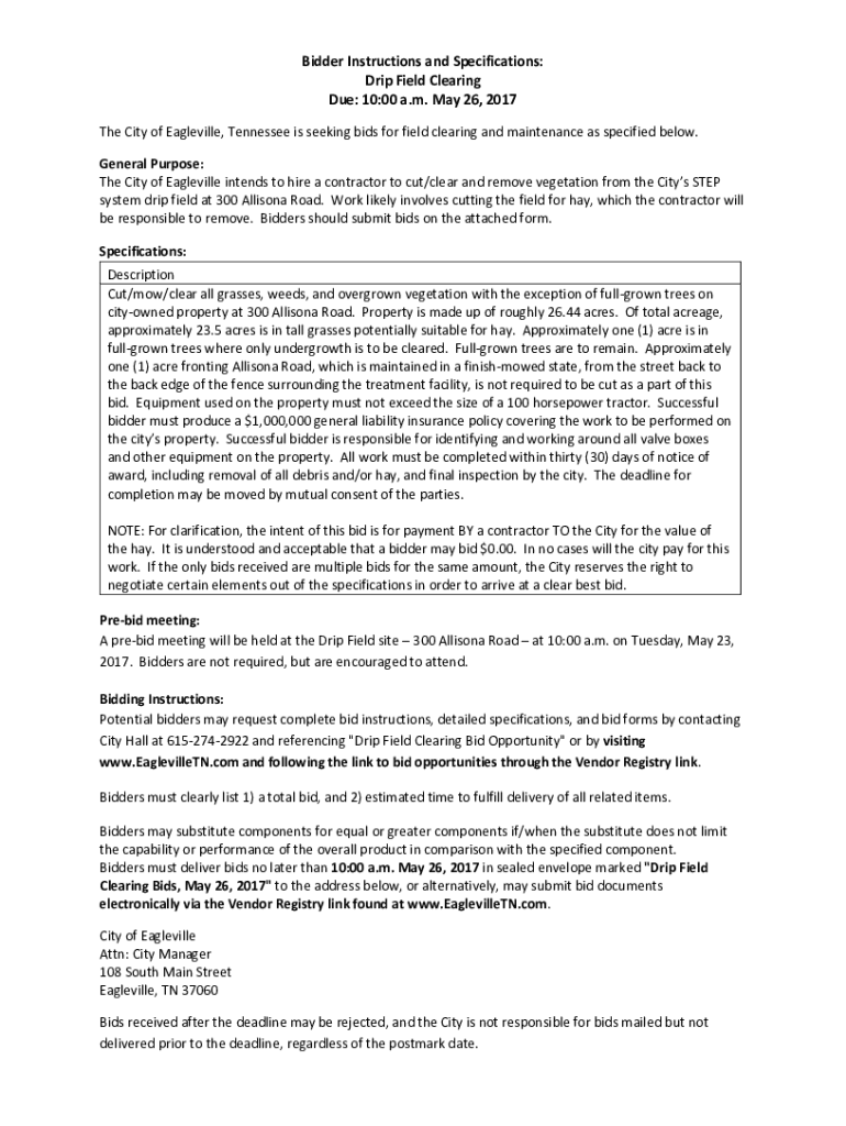 The City of Vaudeville, Tennessee is seeking bids for field clearing and maintenance as specified below.