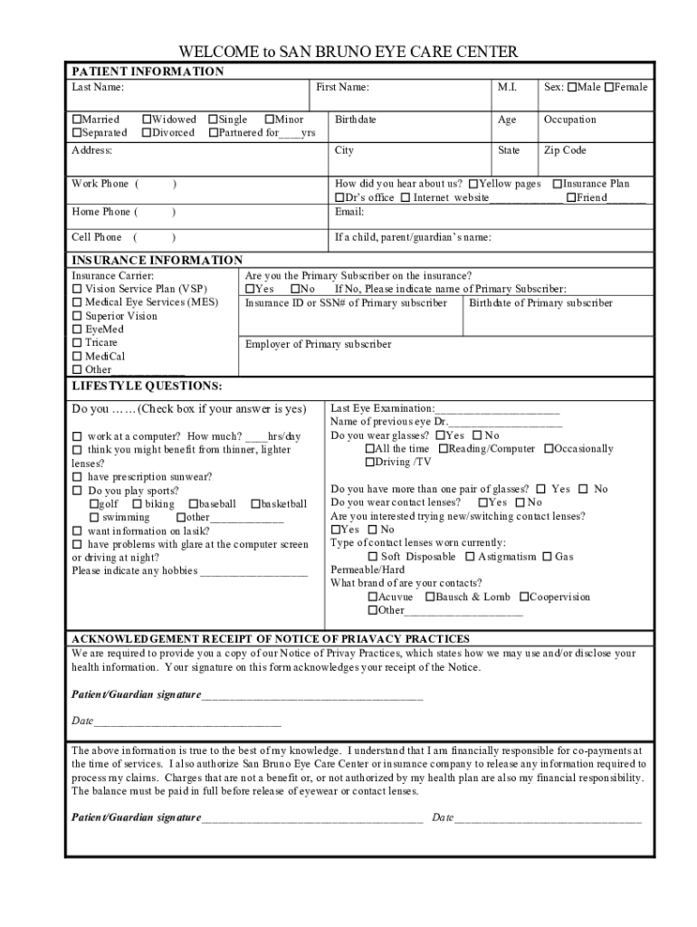 WELCOME to SAN BRUNO EYE CARE CENTER PATIENT INFORMATION Last Name:First Name:Married SeparatedWidowed DivorcedSingle Minor Partnered for readdress:M.I. Sex:MaleBirthdateAgeOccupationCityStateZip