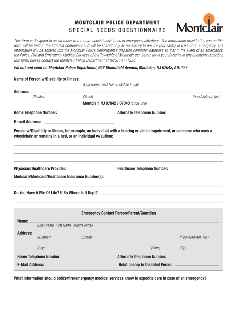 MONTCLAIR R P O L I C E D E PA RT M E N T SPECIAL NEEDS QUESTIONNAIRE This form is designed to assist those who require special assistance in emergency situations. The information provided by you