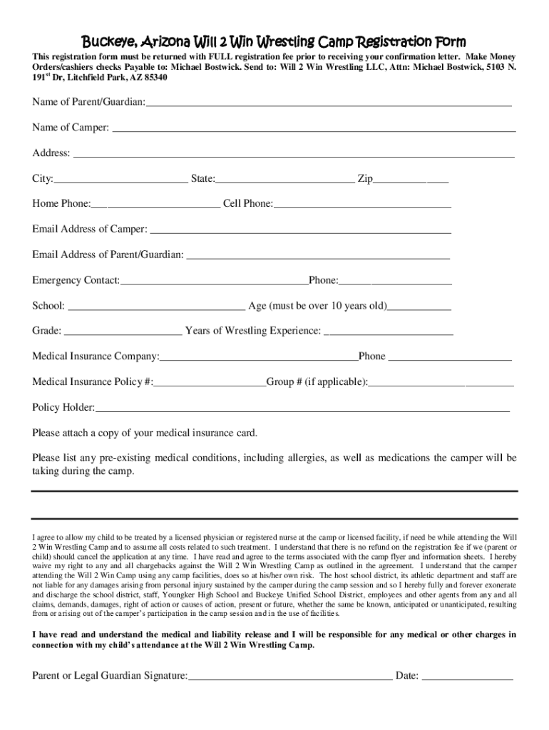 Buckeye, Arizona Will 2 Win Wrestling Camp Registration Form This registration form must be returned with FULL registration fee prior to receiving your confirmation letter. Make Money Orders/cashiers