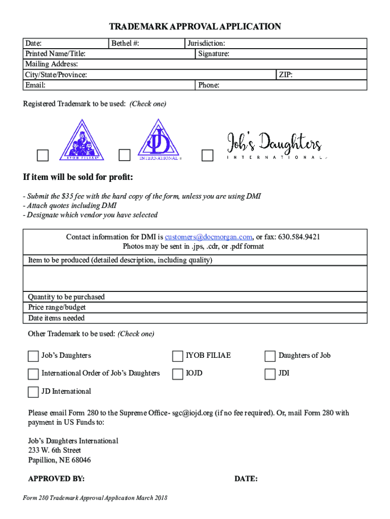 TRADEMARK APPROVAL APPLICATION Date: Printed Name/Title: Mailing Address: City/State/Province: Email:Ethel #:Jurisdiction: Signature: ZIP: Phone:Registered Trademark to be used: (Check one)If item