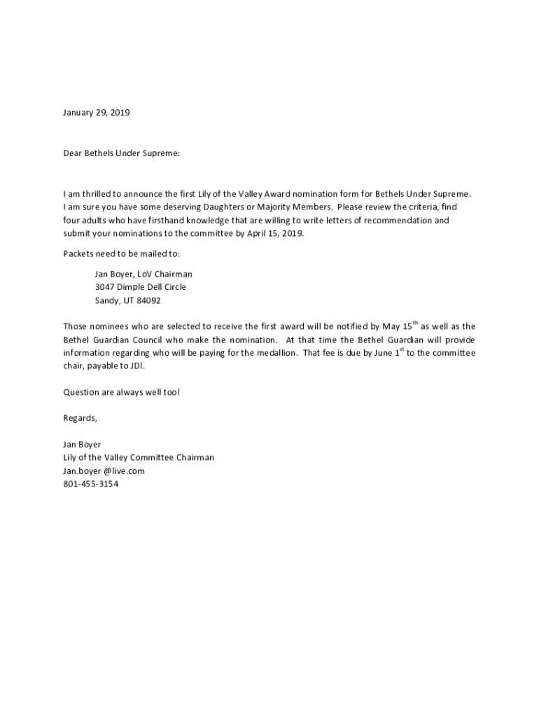 January 29, 2019Dear Bethe ls Under Supreme:I am thrilled to announce the first Lily of the Valley Award nomination form for Bethe ls Under Supreme. I am sure you have some deserving Daughters or Majority Members.
