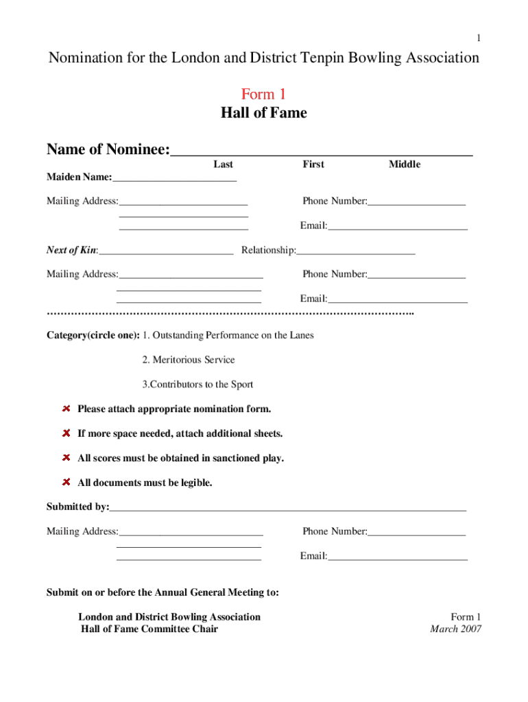 1Nomination for the London and District Tenpin Bowling Association Form 1 Hall of Fame Name of Nominee: Last Maiden Name: FirstMiddleMailing Address: Phone Number: Email: Next of Kin: Relationship: