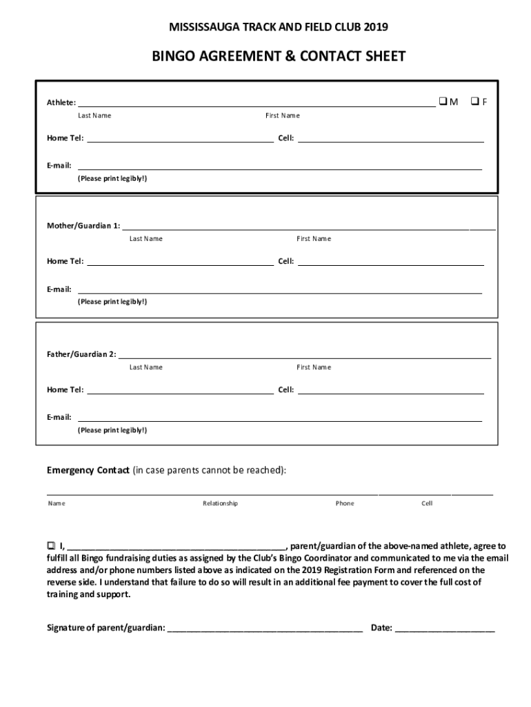MISSISSAUGA TRACK AND FIELD CLUB 2019BINGO AGREEMENT & CONTACT SHEET Athlete: M Last Namesake Tel: Email:First Name Cell: (Please print legibly!) Mother/Guardian 1: Last Namesake Tel: Email:First