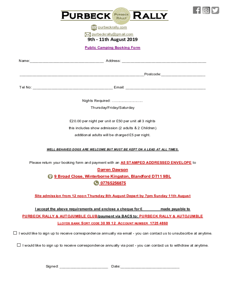 Purbeckrally.com purbeckrally Gmail.com9th 11th August 2019 Public Camping Booking Forename: Address: Postcode: Tel No: Email: Nights Required: .......................... Thursday/Friday/Saturday20.00