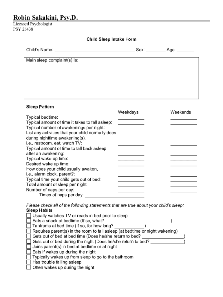 Get the free Sleep Intake Form - Child.docx