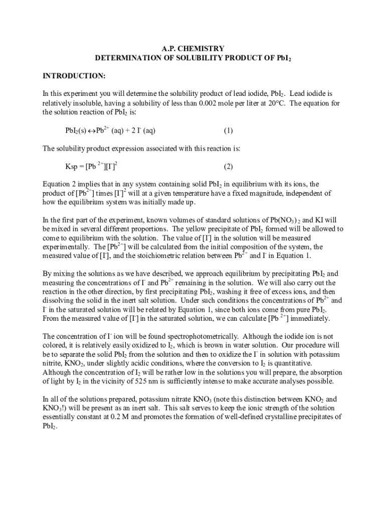 A.P. CHEMISTRY DETERMINATION OF SOLUBILITY PRODUCT OF PbI2 INTRODUCTION: In this experiment you will determine the solubility product of lead iodide, PbI2. Lead iodide is relatively insoluble, having