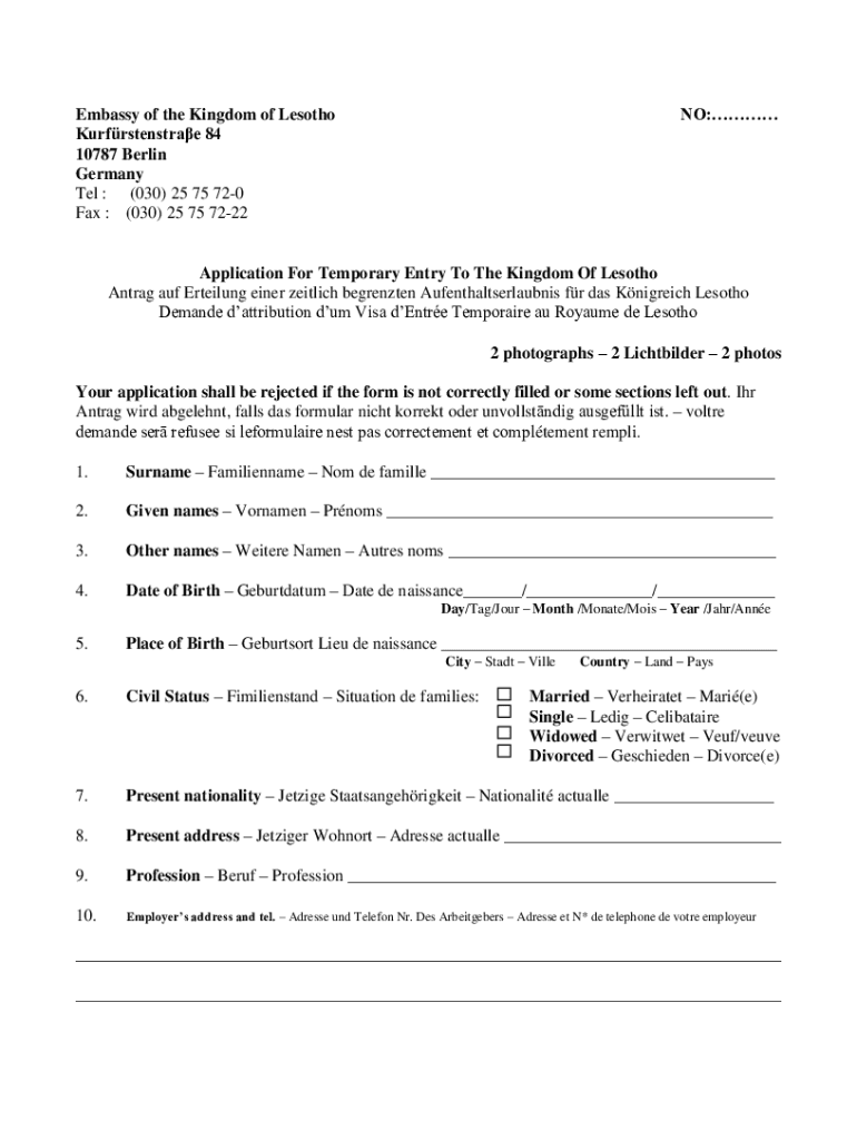 NO:Embassy of the Kingdom of Lesotho Kurfrstenstrae 84 10787 Berlin Germany Tel : (030) 25 75 720 Fax : (030) 25 75 7222Application For Temporary Entry To The Kingdom Of Lesotho Ant rag AUF Derailing