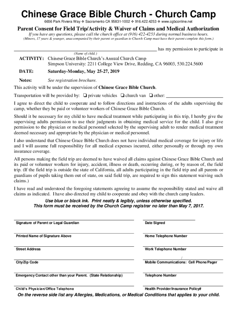 Chinese Grace Bible Church Camp 6656 Park Riviera Way Sacramento CA 958311002 916.422.4253 www.cgbconline.netParent Consent for Field Trip/Activity & Waiver of Claims and Medical Authorization If