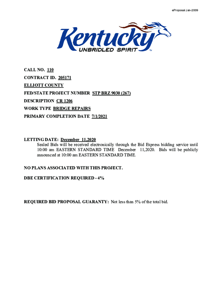 Proposal Jan2009CALL NO. 110 CONTRACT ID. 205171 ELLIOTT COUNTY FED/STATE PROJECT NUMBER STP BRZ 9030 (267) DESCRIPTION CR 1206 WORK TYPE BRIDGE REPAIRS PRIMARY COMPLETION DATE 7/1/2021LETTING DATE: