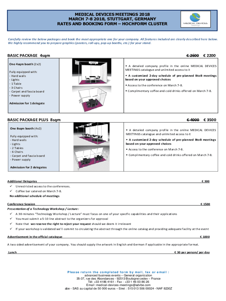 MEDICAL DEVICES MEETINGS 2018 MARCH 78 2018, STUTTGART, GERMANY RATES AND BOOKING FORM ROCHFORD CLUSTERCarefully review the below packages and book the most appropriate one for your company. All features