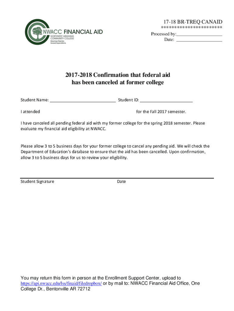 1718 BROTHER CANDID *********************** Processed by: Date: 20172018 Confirmation that federal aid has been canceled at former college Student Name: Student ID: I attended for the Fall 2017 semester.