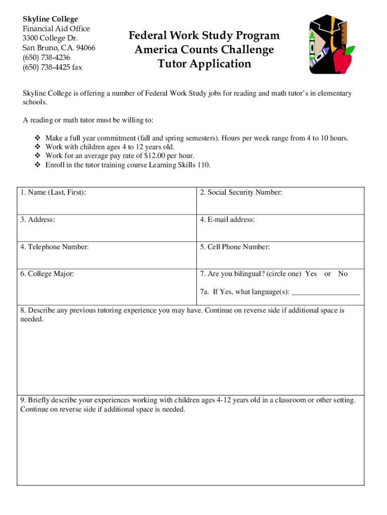Skyline College Financial Aid Office 3300 College Dr. San Bruno, CA. 94066 (650) 7384236 (650) 7384425 fax Federal Work Study Program America Counts Challenge Tutor ApplicationSkyline College is offering