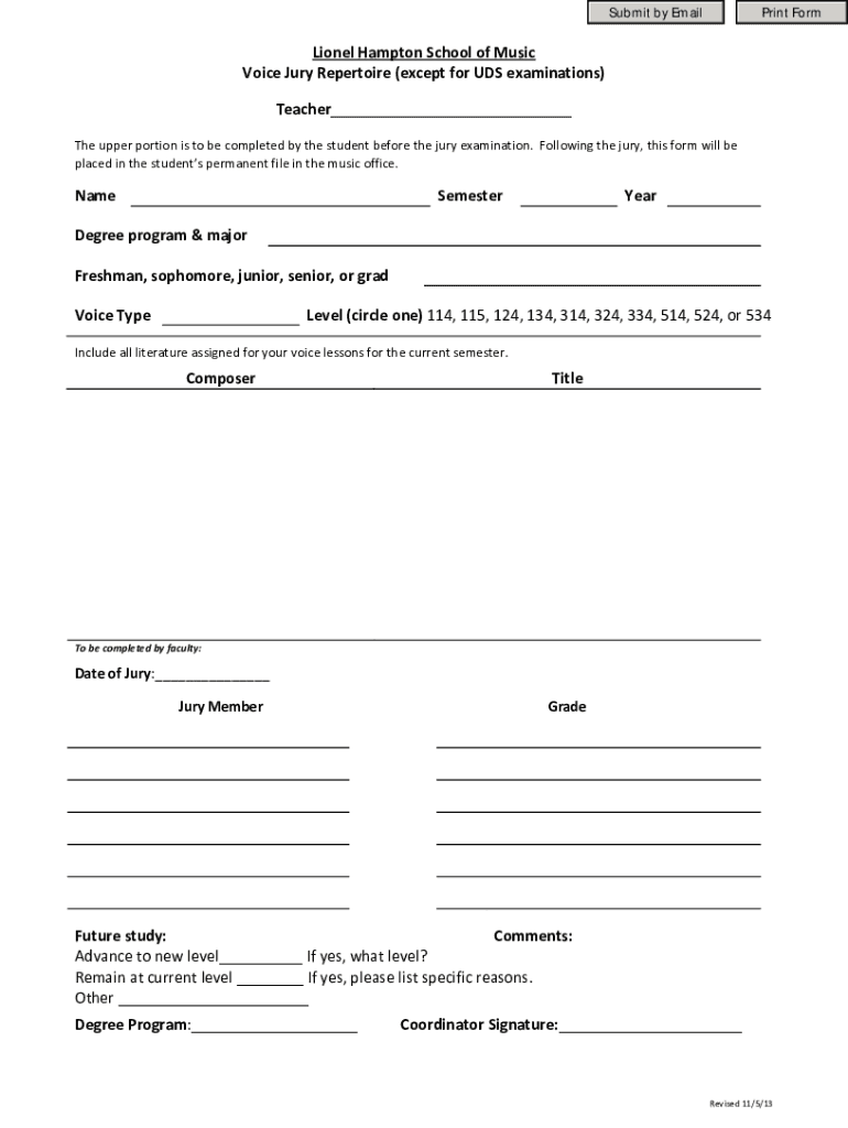 Submit by Emailing Form Lionel Hampton School of Music Voice Jury Repertoire (except for UDS examinations) Teacher The upper portion is to be completed by the student before the jury examination.