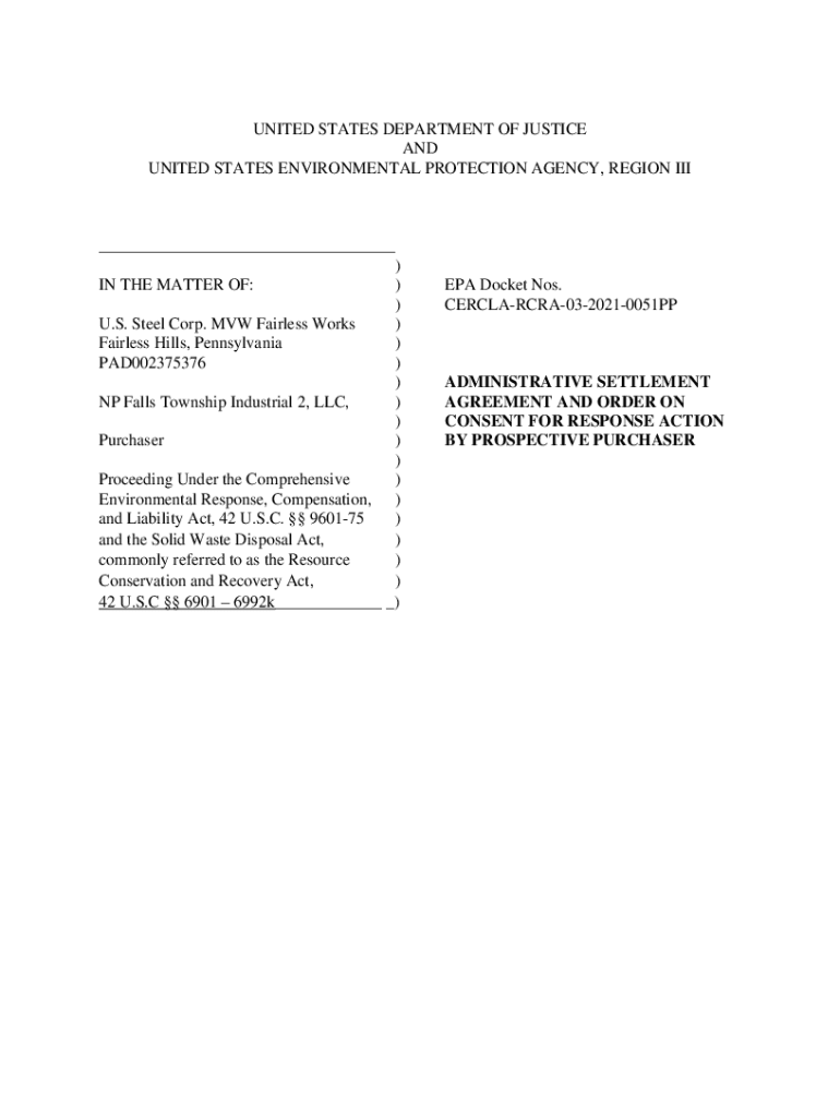 UNITED STATES DEPARTMENT OF JUSTICE AND UNITED STATES ENVIRONMENTAL PROTECTION AGENCY, REGION III) IN THE MATTER OF:)) U.S. Steel Corp. MVP Fearless Works) Fearless Hills, Pennsylvania) PAD002375376))