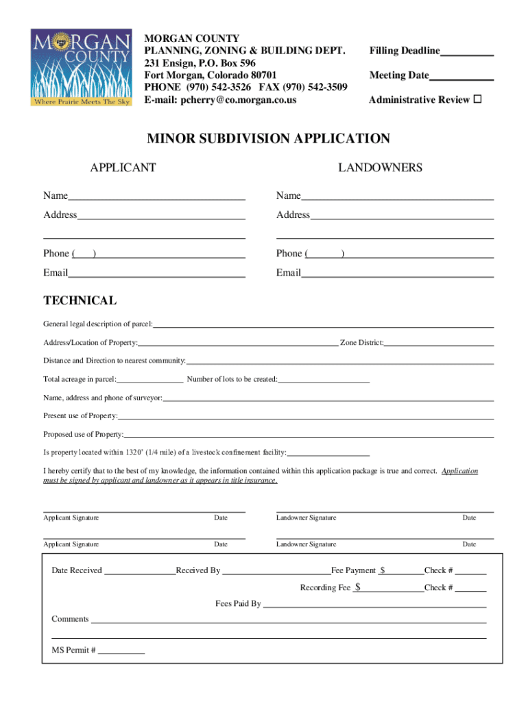 MORGAN COUNTY PLANNING, ZONING & BUILDING DEPT. 231 Ensign, P.O. Box 596 Fort Morgan, Colorado 80701 PHONE (970) 5423526 FAX (970) 5423509 Email: Cherry co.Morgan.co.filling Deadline Meeting Date