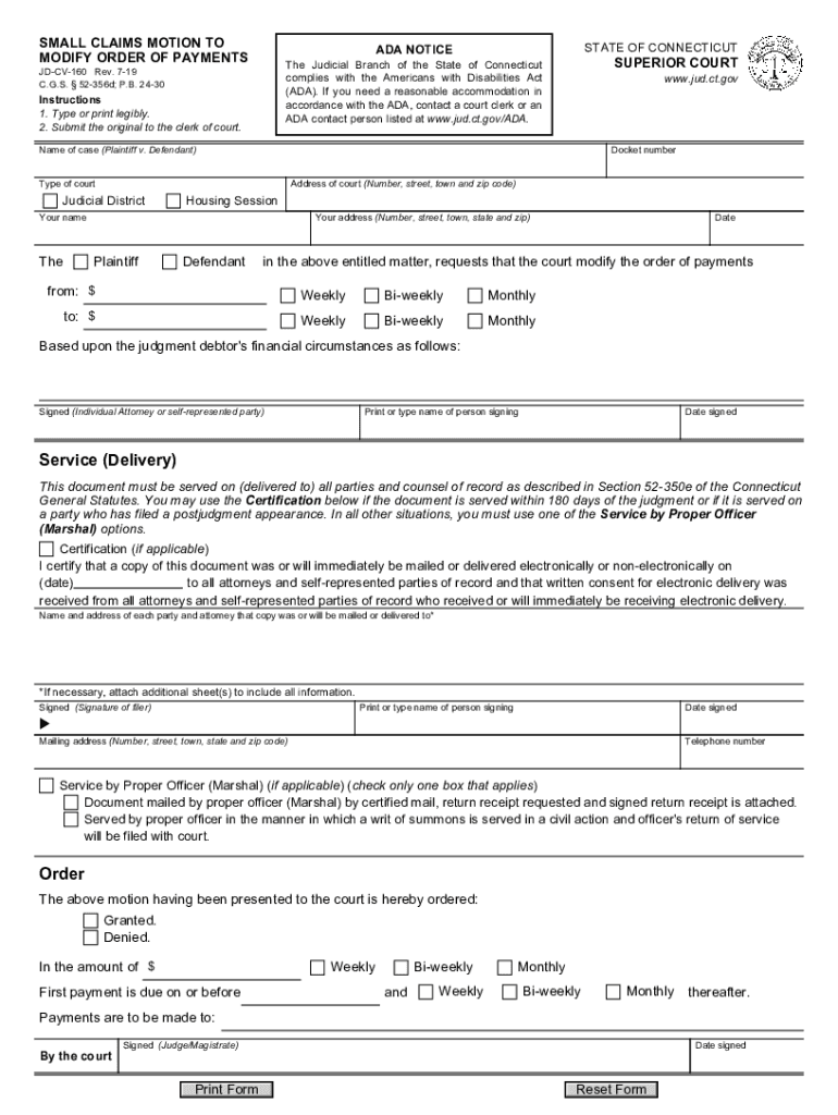 SMALL CLAIMS MOTION TO MODIFY ORDER OF PAYMENTSSTATE OF CONNECTICUT NOTICESUPERIOR Course Judicial Branch of the State of Connecticut complies with the Americans with Disabilities Act (ADA). If you