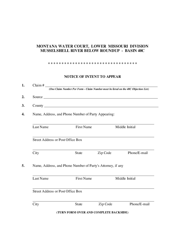 MONTANA WATER COURT, LOWER MISSOURI DIVISION MUSSELSHELL RIVER BELOW ROUNDUP BASIN 40C *********************************NOTICE OF INTENT TO APPEAR 1. Claim # (One Claim Number Per Form Claim Number