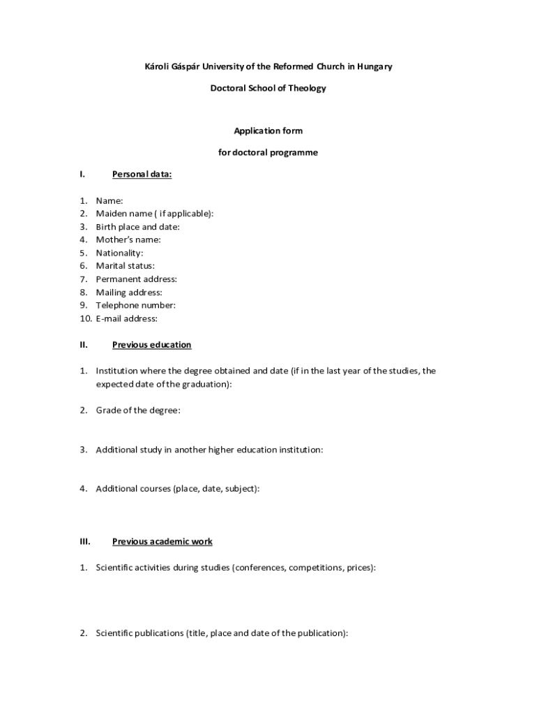 KroliGsprUniversityoftheReformedChurchinHungary DoctoralSchoolofTheology Application form fordoctoralprogramme I. 1. 2. 3. 4. 5. 6. 7. 8. 9. 10. II. 1.2.3.4.III. 1.2. Personal data: Name: Maiden name(inapplicable):